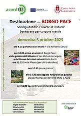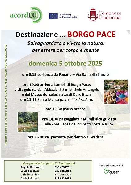 Si tratta di una visita/gita programmata e realizzata in data 05/10/2025 come attività rivolta alla comunità locale adulta del comune di Gradara con l’obiettivo di sensibilizzare i partecipanti ai temi della salvaguardia ambientale e far comprendere loro la forte sinergiafra natura, cultura e benessere.