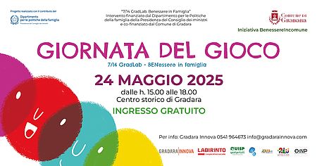 L'evento si inserisce nel Progetto “7/14 GradLab. Benessere in Famiglia”, intervento finanziato dal Dipartimento per le Politiche della famiglia della Presidenza del Consiglio dei Ministri e co-finanziato da Comune di Gradara